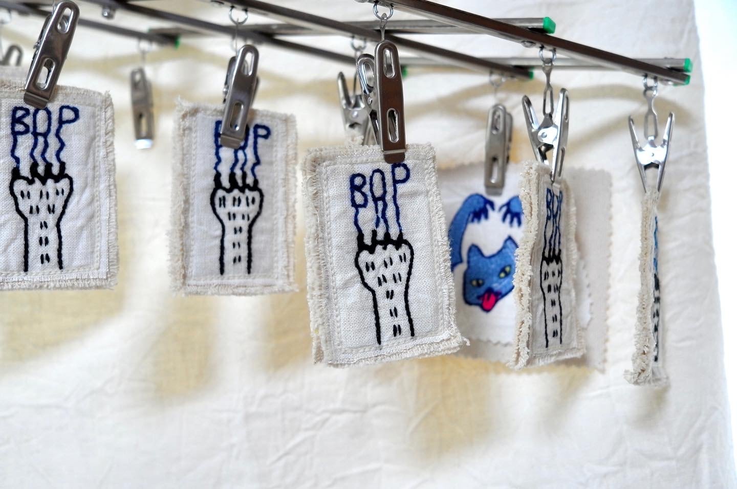 糸をほつれさせたり、線をゆがませたり、布を黄ばませたりして、レトロ感をだしました。